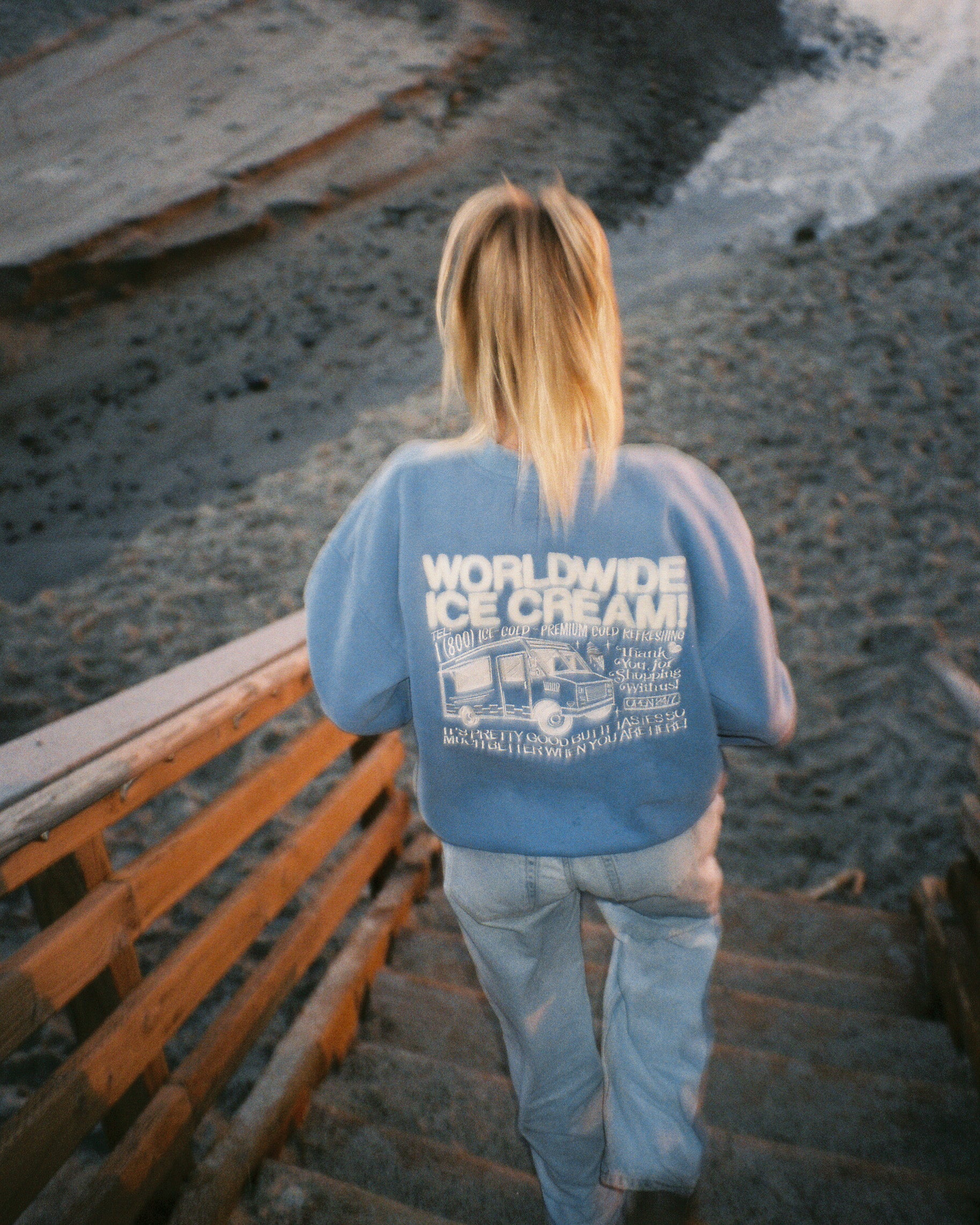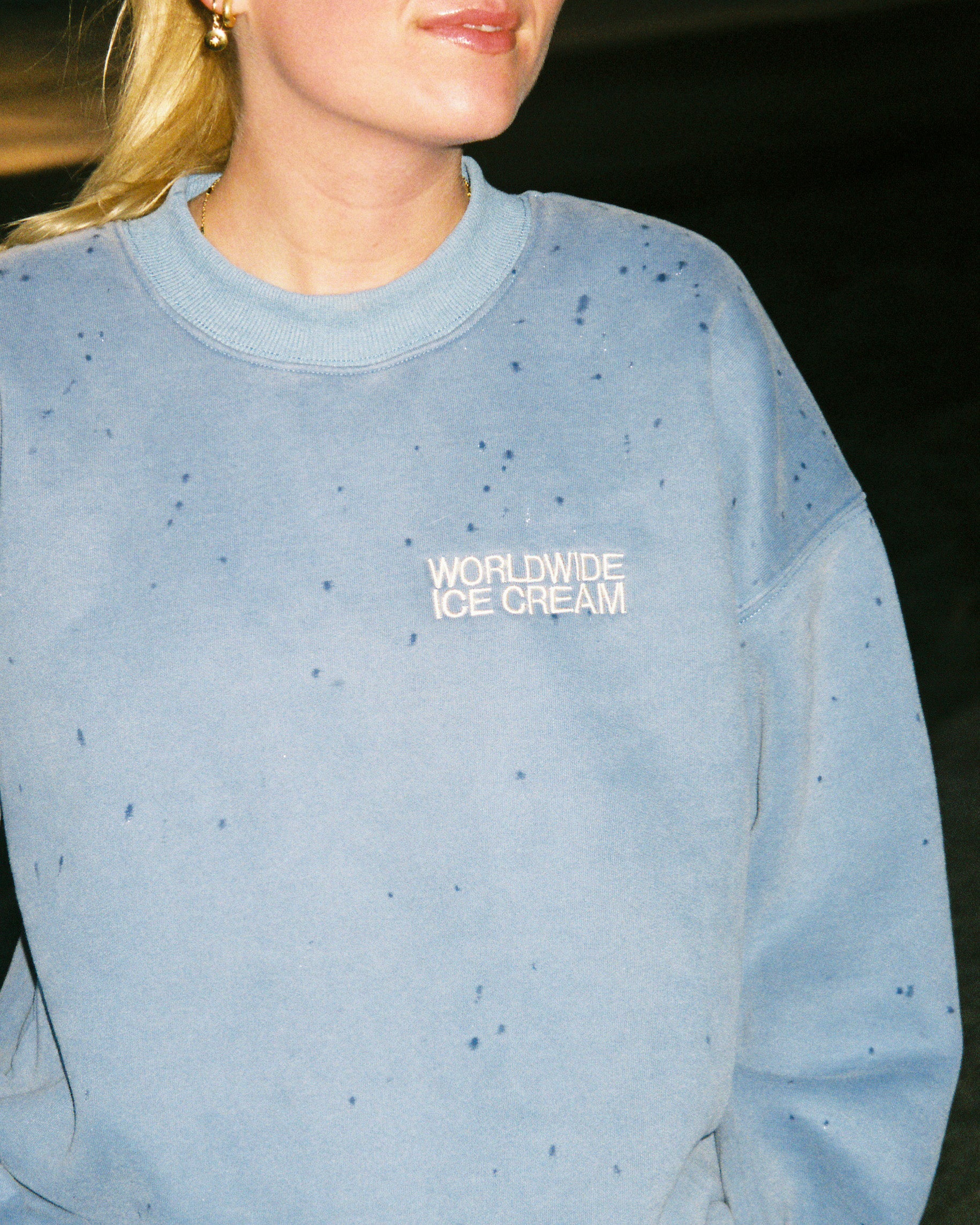 “WORLDWIDE ICE CREAM” is vintage chenille embroidery, meaning it is towel-like fluffy embroidery. Part of the vintage appeal is the imperfection in the line work/stitching. To preserve the chenille embroidery, we recommend washing this garment inside-out on low tumble. Air drying is recommended as well.